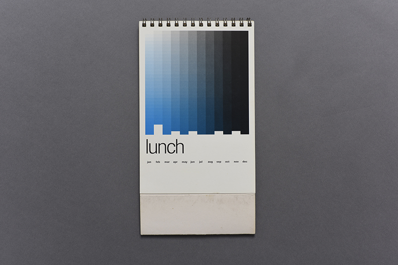This desk calendar groups all the days of the week together on each page. The dates for each day of the week are listed at the bottom, arranged month by month. The coloured grid system is compossed of 12 vertical columns (one for each month), and 31 horizonal cells representing each day of the month (the corresponding days of the week are left blank on each page). The white lines which form the grid become progressively thicker as you move through the week.The verso of each page features a full coloured grid with the word 'today' at the bottom. A seperate page highlights all the public holidays throughout the year – with the coloured cells taken from the daily pages.